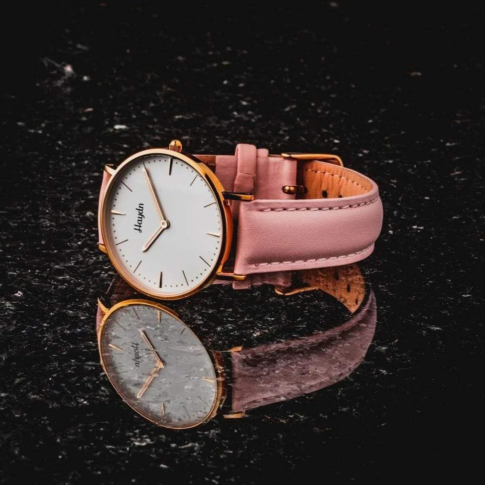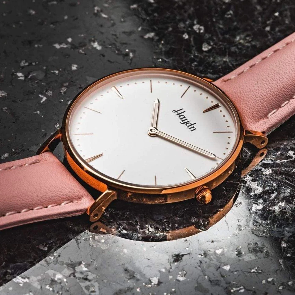 • التفاصيل: عقارب الساعة رفيعة وذهبية اللون، واسم العلامة التجارية “Haydn” مكتوب بخط أنيق أسفل موضع الساعة 12.