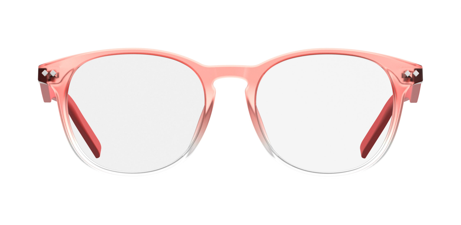• الإطار: الإطار مصنوع من البلاستيك الشفاف بتدرج لوني فريد. يبدأ الإطار بلون أحمر أو مرجاني في الجزء العلوي، ويتدرج ليصبح شفافاً في الجزء السفلي، مما يمنحها مظهراً خفيفاً ومميزاً.